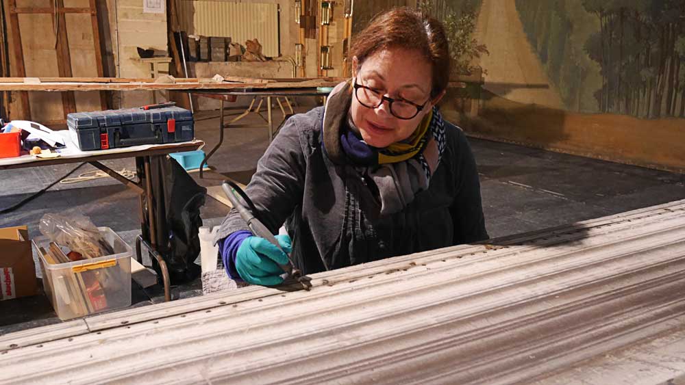 Une restauration était donc indispensable avant sa présentation dans l’exposition. Mais restaurer une peinture à la colle est une action irréversible, le repeint étant apposé sur une peinture sans vernis. Puisqu’une restauration traditionnelle n’était pas envisageable, il a fallu accepter de présenter un décor vieilli. Un conseil scientifique rassemblant des experts du théâtre et des conservateurs spécialisés ont ainsi établi que la seule intervention possible consistait à dépoussiérer et consolider les bois, les tissus et les papiers. Dans les lacunes qui empêchent la compréhension de l’architecture, il a été décidé en parfaite harmonie avec l’équipe de dix restauratrices intervenues au printemps 2016 de les combler avec un pastel réversible. Les papiers disparus à l’envers des toiles tendues sur les châssis ont été remplacés par du papier de même facture fourni par un moulin qui travaille à l’ancienne.